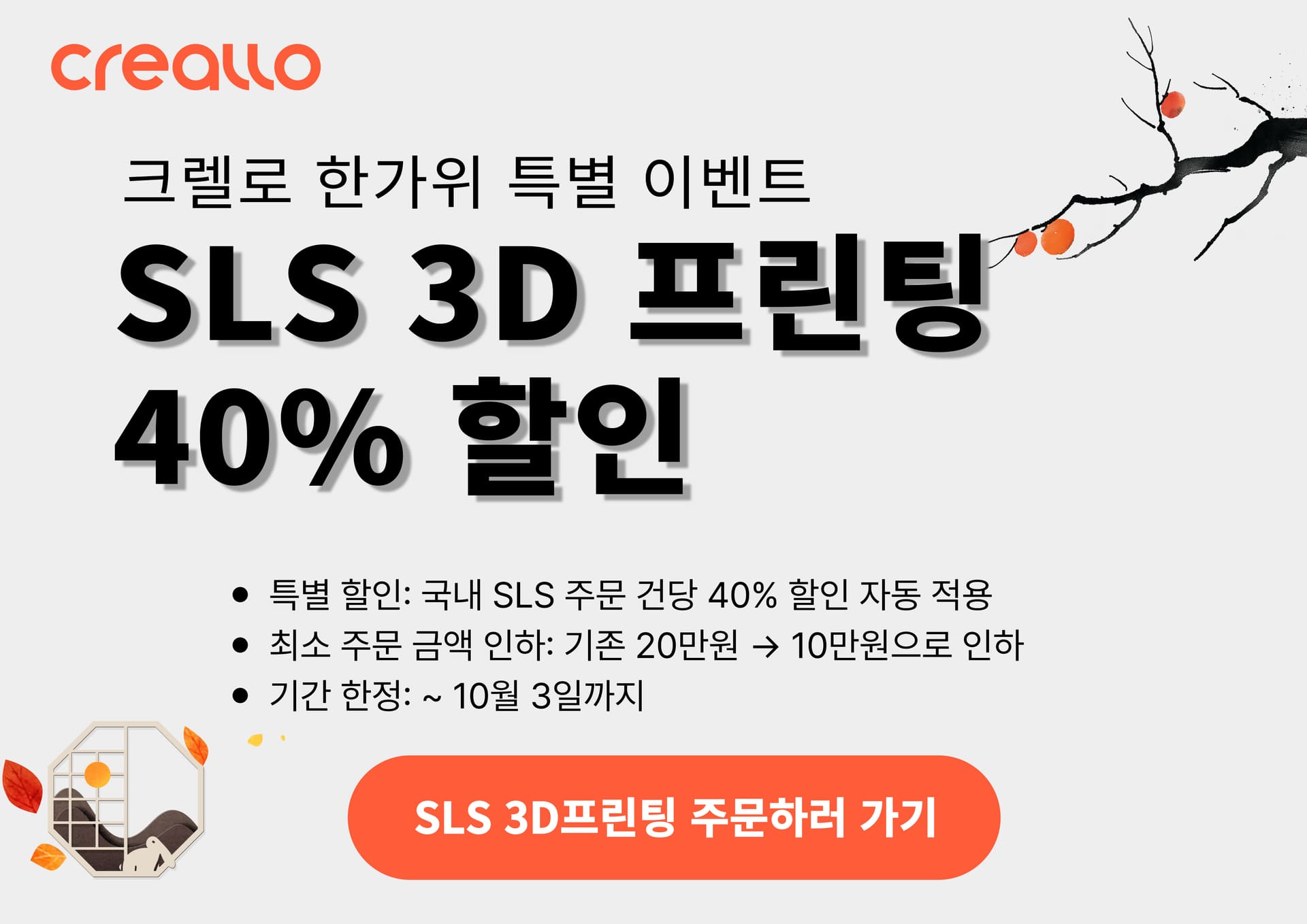 이번 SLS 3D프린팅 40% 할인 이벤트는 10월 3일까지 한정 기간 진행됩니다.