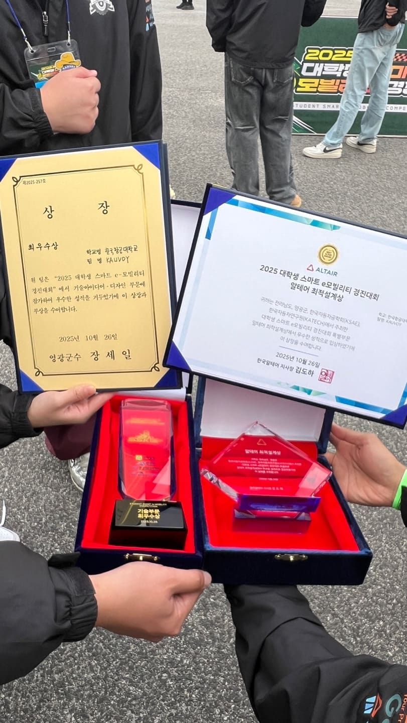 Kauvoy 자작자동차 동아리는 ‘2025 대학생 스마트 e-모빌리티 경진대회’에서 기술 부문 최우수상(영광군수상)과 알테어 최적설계상을 동시에 거머쥐는 쾌거를 이루었습니다.